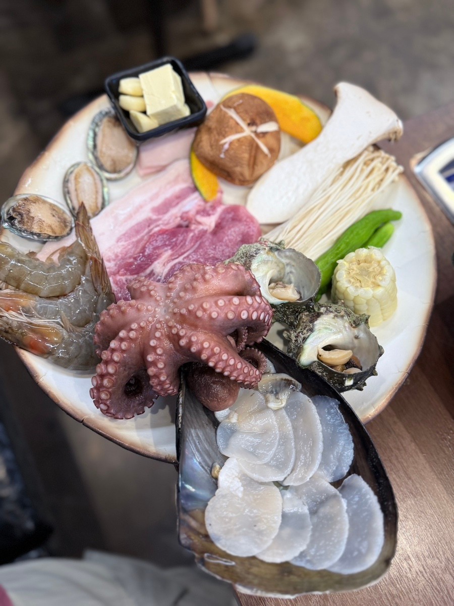 해산물이랑 흑돼지 삼합이라 너무 좋았어요. 전복 뿔소라 버터구이 맛나요