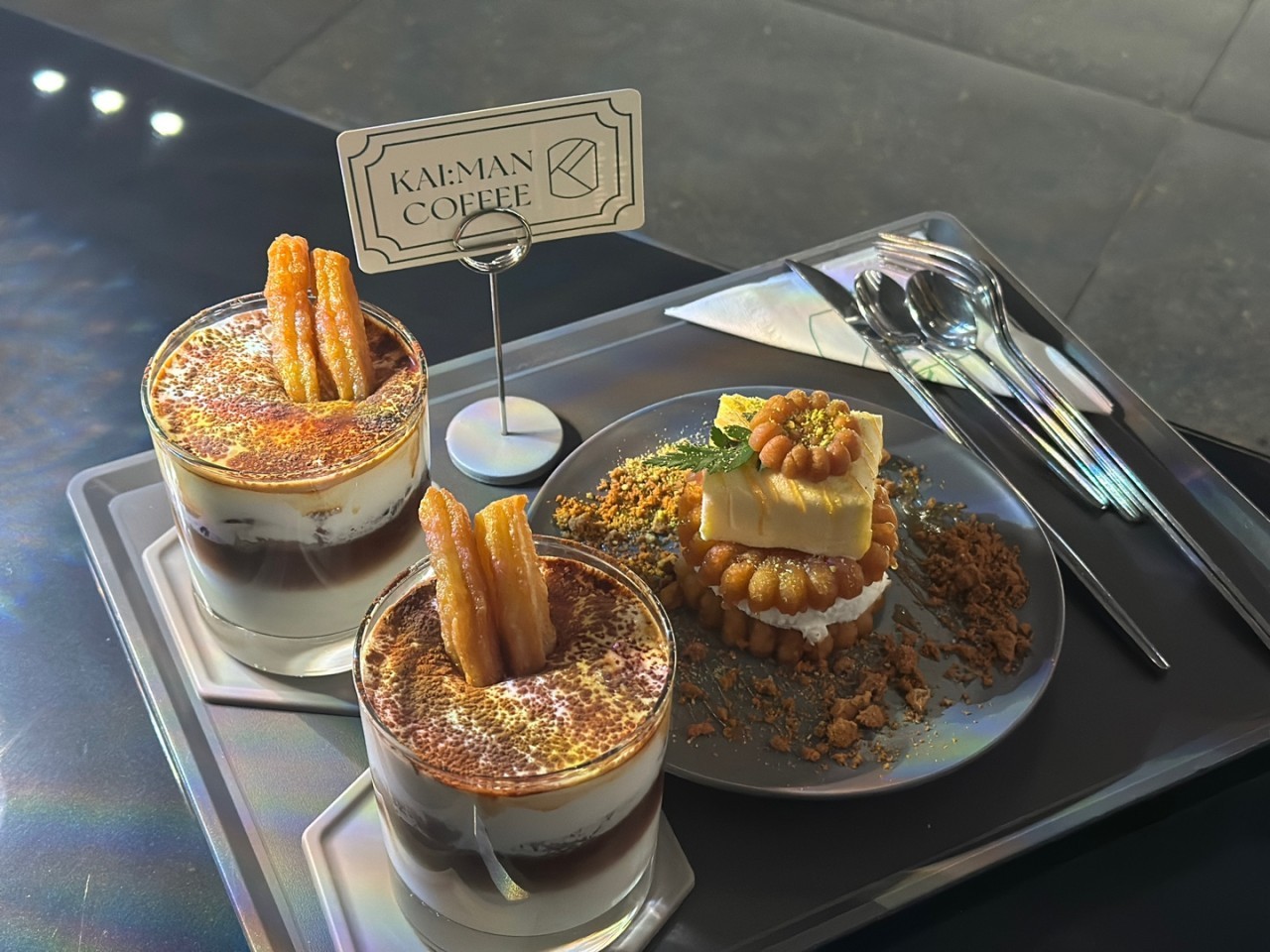 미술관에 온듯한 착각이 드는 멋진 인테리어와 조명 그리고 다양한 음료와 디저트도 있습니다 카이만카페라는 이름에서 예상되는 흔하게 만날수 없는 카이막 디저트를 맛볼 수 있는 곳이기도 해요