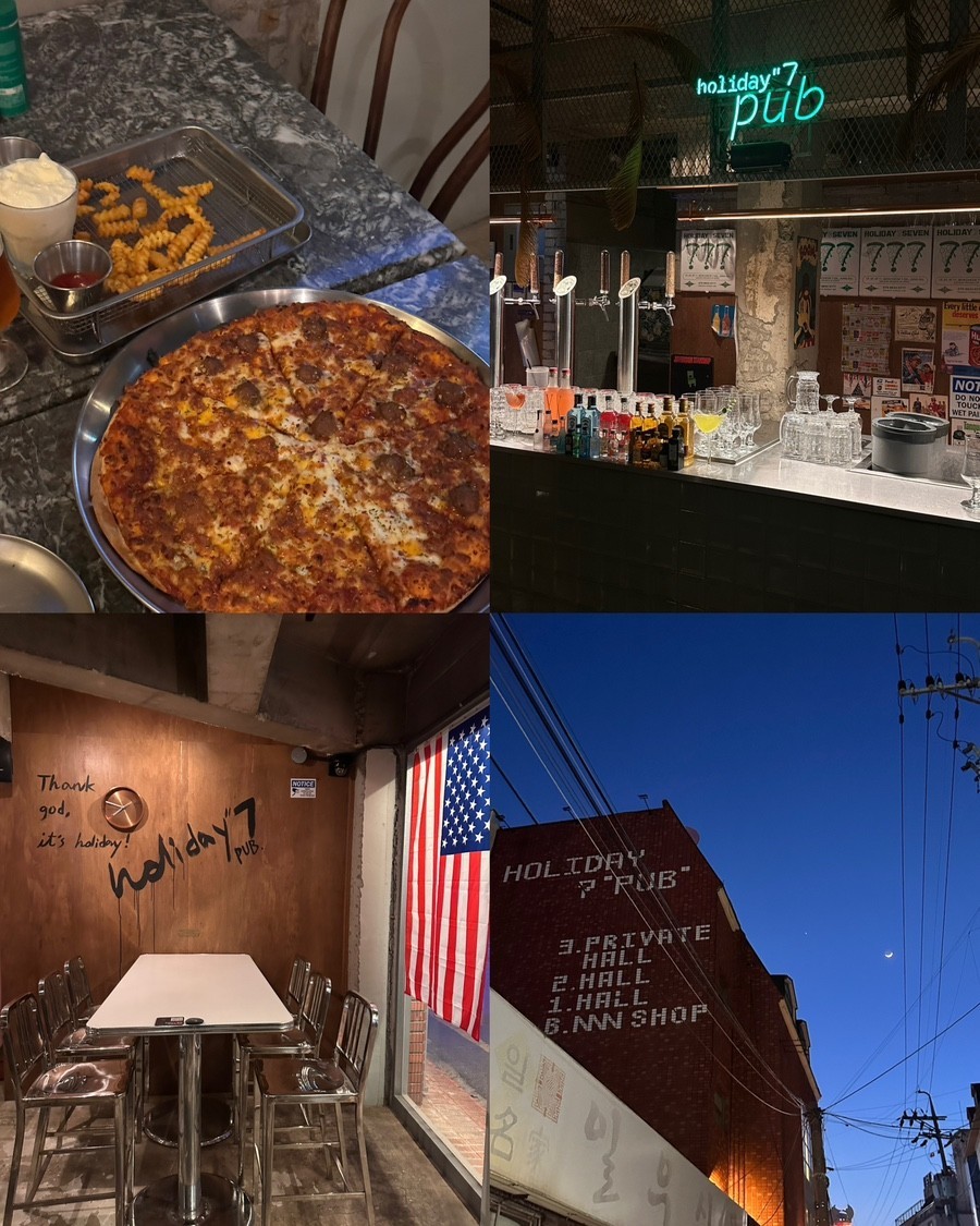 22[대전은행동] 미국식 피자 맛집홀리데이 세븐피자펍 (holiday 7)소개해드릴게유~~ 바로바로홀리데이 세븐펍 은행동 본점입니다.대전중앙로역 9번출구에서 도보 5분정도 걸으면 나오는 골목길에 있는 맛집이에요! 사실 대로변이 아닌 골목길에 있어서 찾기는 쉽지 않았지만, 보통 맛집들은 찾아가잖아요?! 멀리서 보이는홀리데이 세븐펍!! 한 건물을 다 쓰시나봐요 거대합니다 외관 핫하죠.. 제가 제일 좋아하는 외국갬성 인테리어...