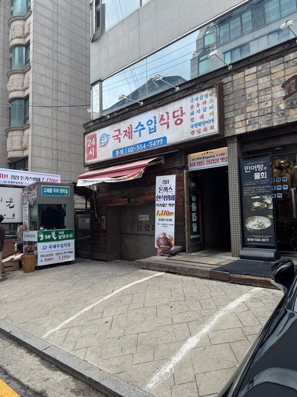 5[국제수입식당 본점] 강남에서 제일 싼 냉삼집|국제수입식당 본점위치 :서울 강남구논현로79길 62 영업시간: 연중무휴 11:00~24:00 (주말 23시 마감) 브레이크타임 : 평일 15:00~17:00 가격 : 냉동삼겹살(4,900원), 수제왕돈까스(8,000원), 순두부찌개(7,000원)국제수입식당 본점2번째 방문한 강남에서 제일 싼 냉삼집 100g씩 주문 가능하고 사이드도 많은 편 나올 때는 양이 적어보이지만 2명이 사이드에 3인분...