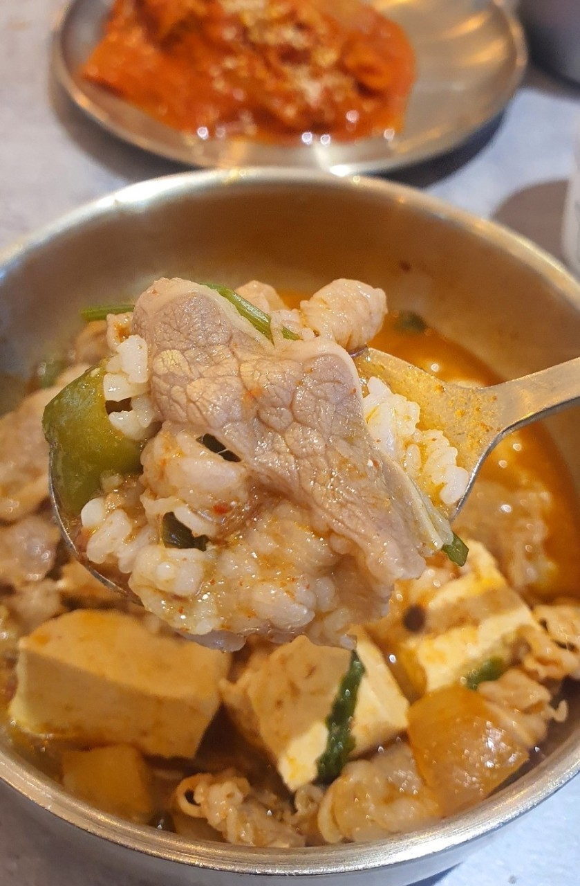 동료들과 1시쯤 방문. 넉넉한 재료와 정갈하게 나오는 된장전골. 기본찬으로 나오는 김치 볶음과 테이블에 있는 김도 맛있음.
