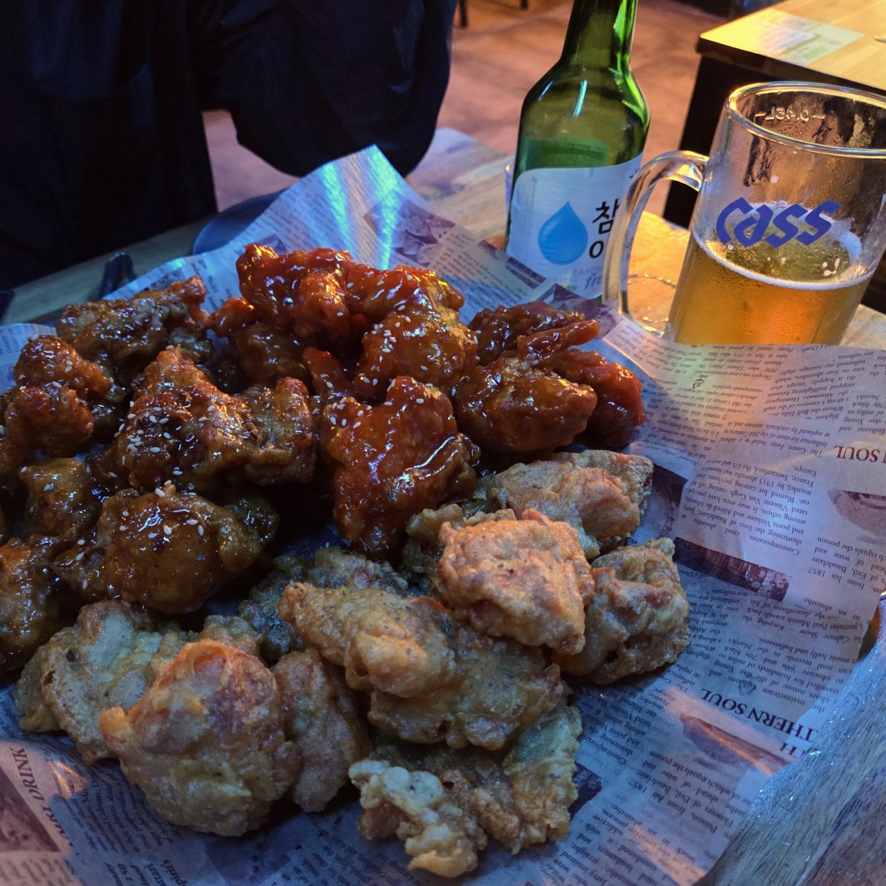 회식할 땐 서면 술집 머거보계에서 ㅎㅎ 후라이드 치킨과 애플양념, 마늘간장 반반치킨이 나왔습니다!