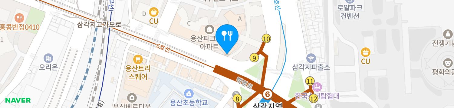 쿠마반점은 삼각지역에서 도보 5분 거리에 있는 용산파크자이 상가 1층에 있어요. 통창으로 내부가 보이는 구조라 깔끔한 분위기를 확인하고 들어갈 수 있었답니다.