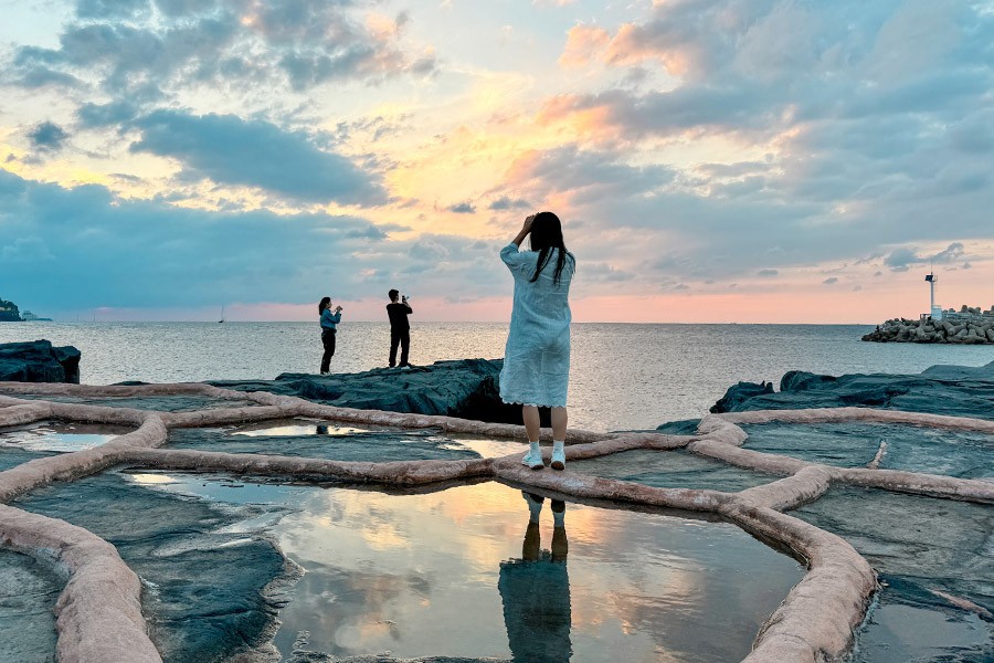 제주 여행 마지막 날, 가벼운 마음으로 방문했던 ‘구엄리돌염전‘. 큰 기대 없이 그냥 잠깐 들렀던 곳이었는데, 막상 눈앞에 펼쳐진 풍경은, 꽤 오래도록 기억에 남았다. 바닷바람은 시원하게 불어오고, 물이 말도 안 되게 맑고 투명해서 한참을 그냥 멍하니 서서 바라보고 있었다. 바위 위에 황토색 테두리로 만든 돌염전이 펼쳐져 있었는데, 그 물웅덩이마다 맑은 하늘을 하나씩 담고 있었고, 그리고 그 하늘 아래, 햇살이 천천히 쓰다듬듯 바다를 비추고 있었는데, 그 반짝임들이 참 예뻤다. 사람이 많지도 않고 과하게 꾸며놓은 것도 없는데, 그게 오히려 이곳을 더 자연스럽고 특별한 공간으로 만들어줬다. 돌끝에 서서 끝이 안보이는 넓은 바다를 보고 있으니, 마음이 한결, 가벼워졌던 순간이었다.